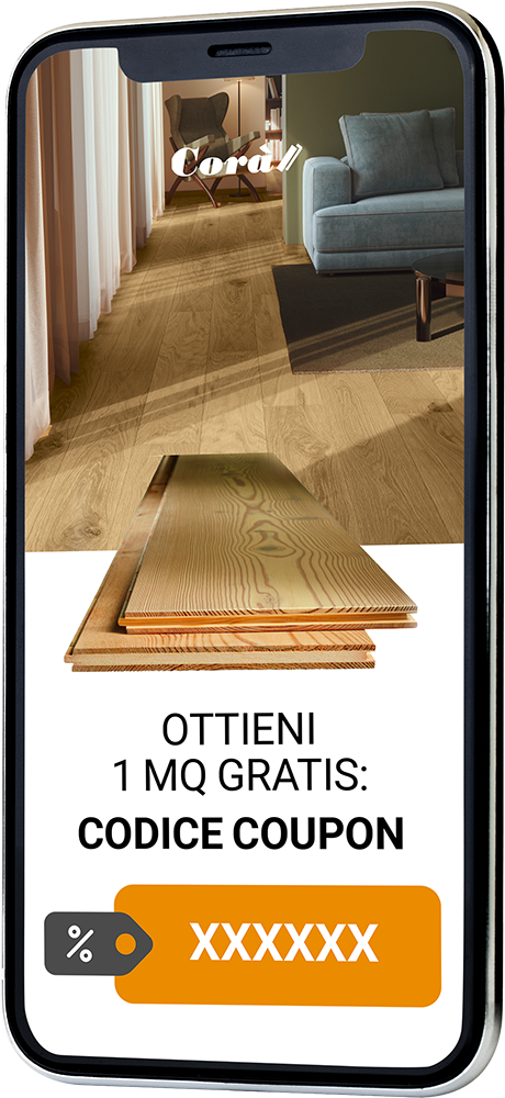 Condizioni: il metro quadro gratuito è valido solo per forniture di parquet Collezione Easy maggiori di 70 m². Il coupon non è cumulabile ed è valido solo presso i rivenditori aderenti all'iniziativa. Offerta non valida su immobili con Corà a capitolato. Offerta valida solo se esercitata al momento dell’acquisto. La società si riserva di sospendere e/o modificare la promozione fermo restando i diritti acquisiti dai codici promozioni distribuiti.